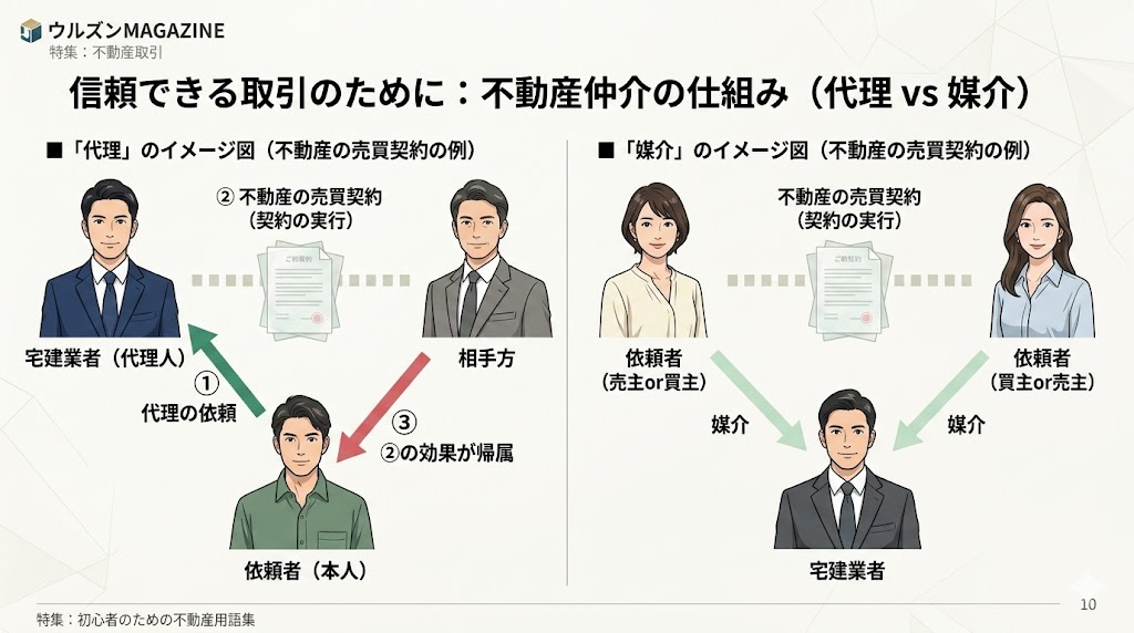 結論を先に述べます。両手仲介が日本で違法でない理由は、不動産仲介が法律上「媒介(ばいかい)」であり、「代理(だいり)」ではないとされているからです。