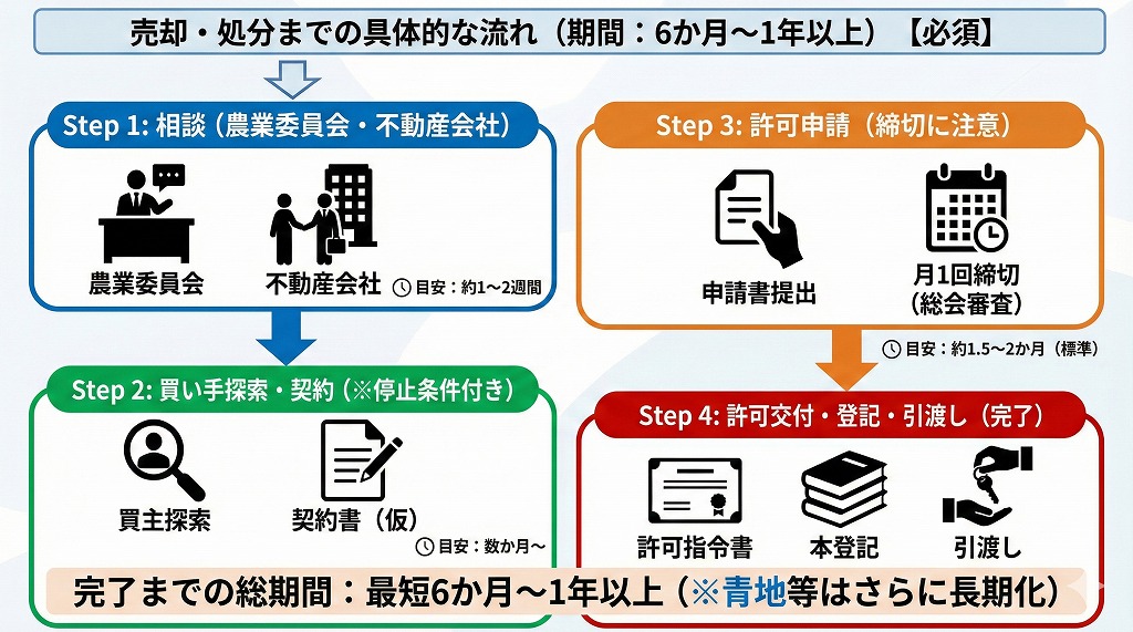 農地の売却は、普通の宅地と違って多くの手続きと時間が必要です。ここでは、実際に農地を売却する場合の具体的な流れと、それぞれのステップでかかる期間について説明します。